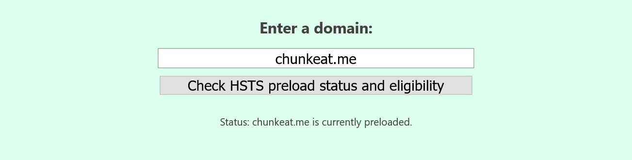 The domain chunkeat.me had succesfully added to HSTS Preload list. This inculded all subdomain.